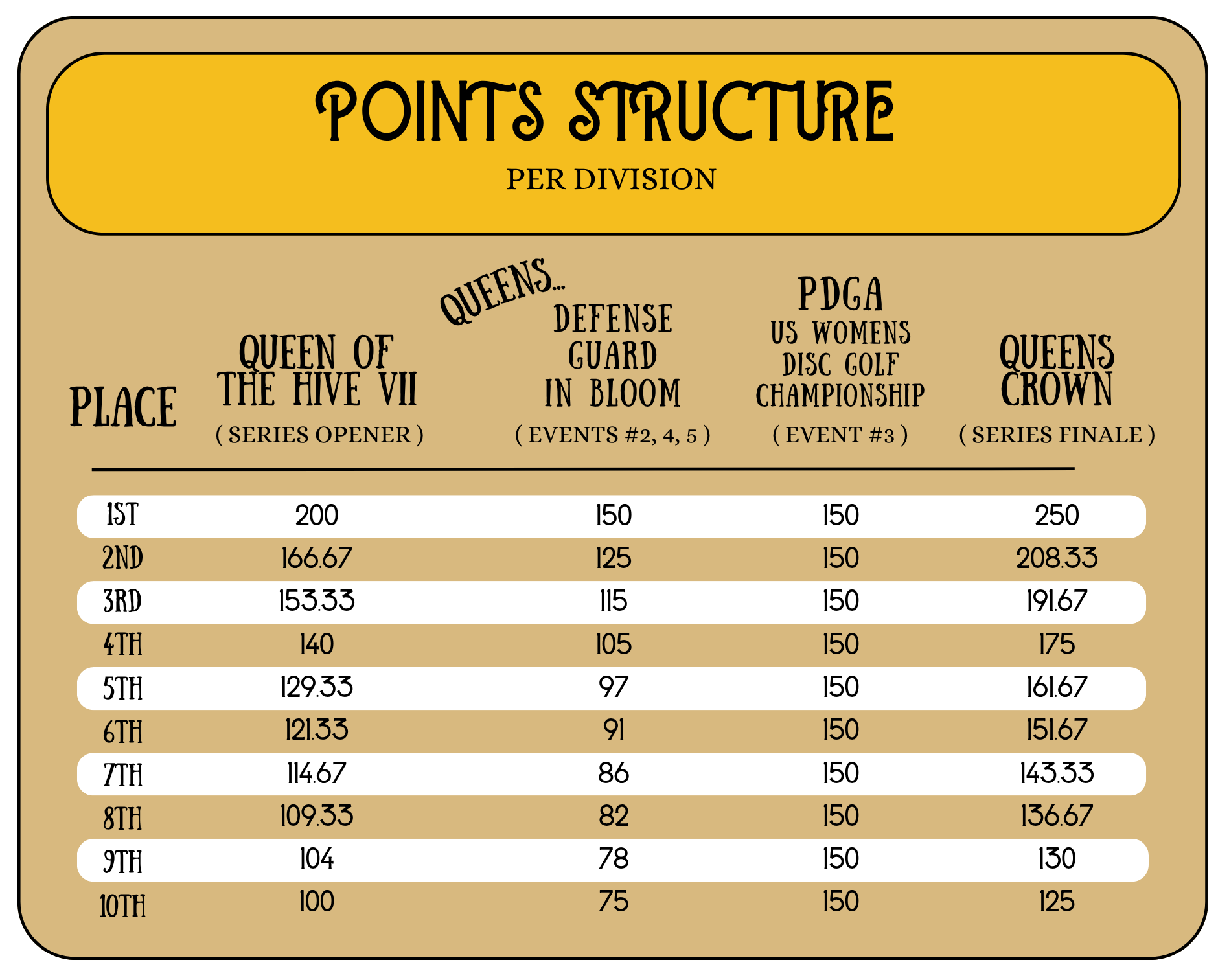 The Salty Queens Series includes 6 events total, with players earning points based on their finishing position in each event.
